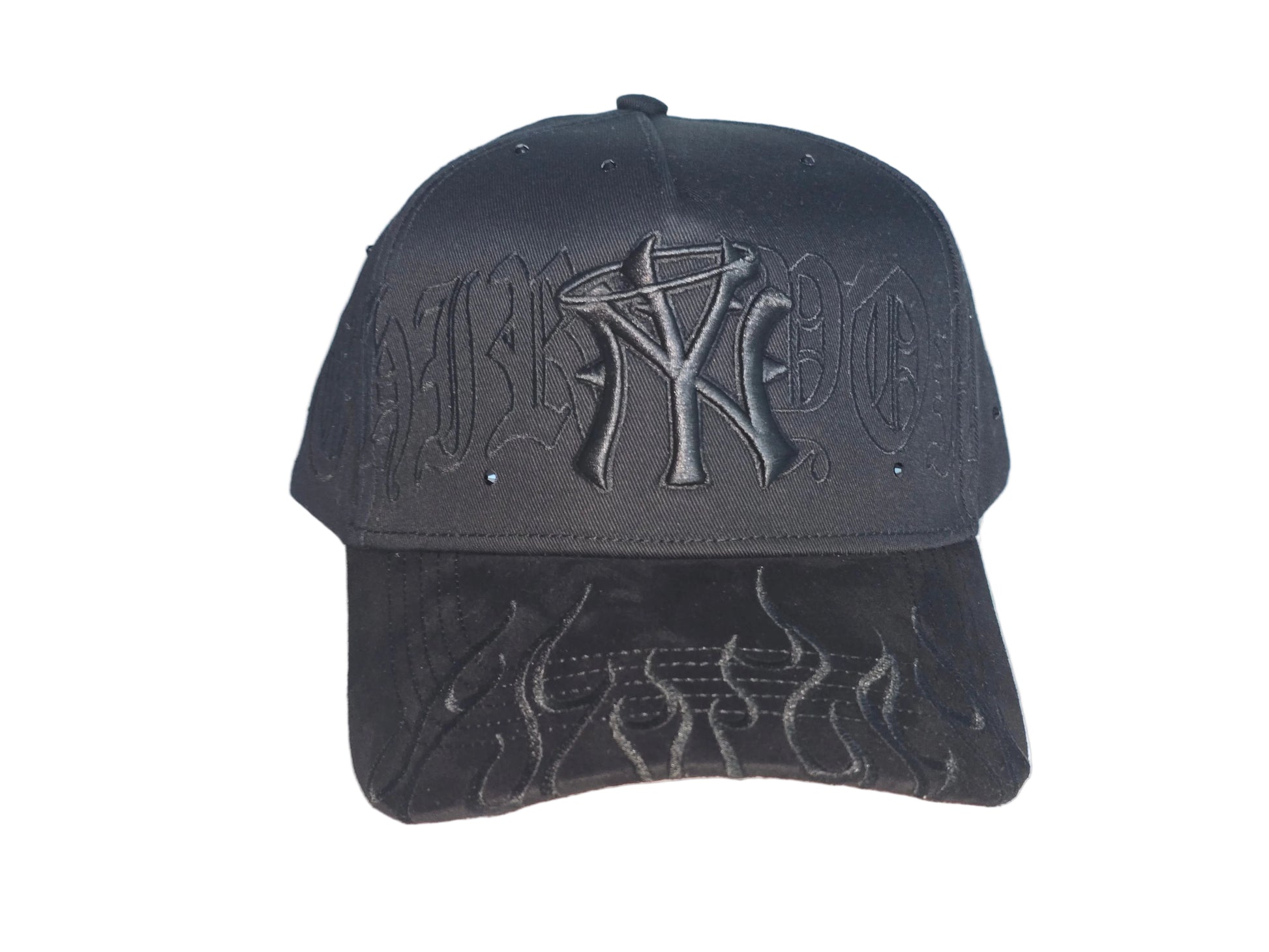 The front panel boasts bold gothic-style "NEW YORK" embroidery encircling the iconic interlocking NY logo, all in tone-on-tone black threading for a sleek, monochromatic vibe. The back showcases a subtle "31" emblem, nodding to the brand's signature, while the adjustable snapback strap ensures a customizable fit for all head sizes.